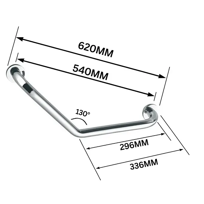 Barra de seguridad angular de 130° ideal para baños adaptados, fabricada en acero inoxidable AISI 304 satinado antideslizante. Con una longitud de 62 cm y diseño ergonómico, esta barra aporta soporte seguro y estética moderna en entornos residenciales y públicos.