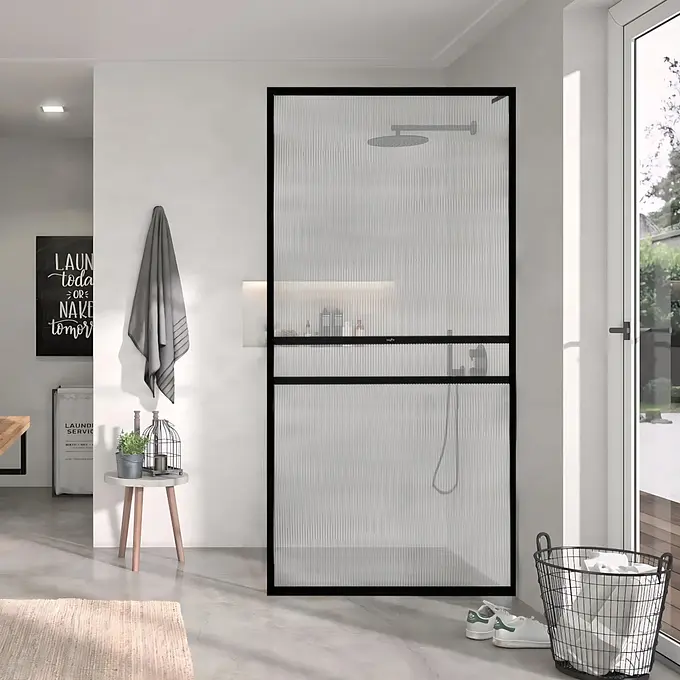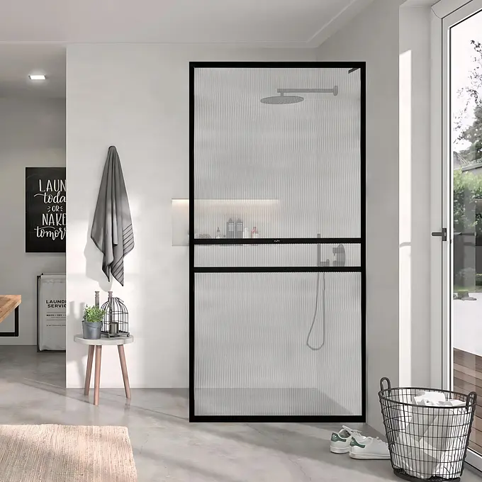 Materiales de calidad: El cristal acanalado utilizado en la mampara es reconocido por su durabilidad y fácil mantenimiento, asegurando una larga vida útil y conservación de su apariencia original.