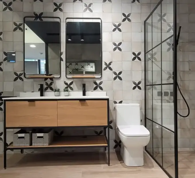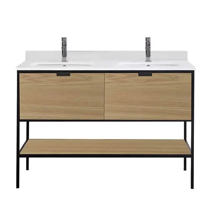 Mueble para Lavamanos Doble / Marco Negro Acero Inoxidable / Dos Cajones Cierre Suave con Tirador / Lavabo y Repisa Inferior Incluido / Cubierta de Cuarzo / No Incluye Grifería / Foto Referencial