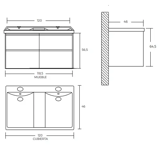 - Incluye lavamanos doble de Fineceramic con rebalse