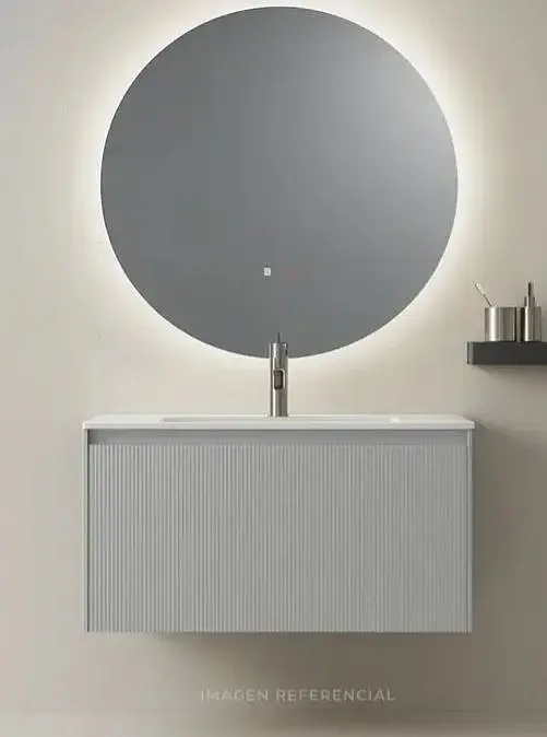 Este mueble suspendido con frente acanalado y lavamanos de resina de la marca Wasser es una solución elegante y funcional para modernizar su baño, combinando diseño contemporáneo con materiales de alta calidad.
