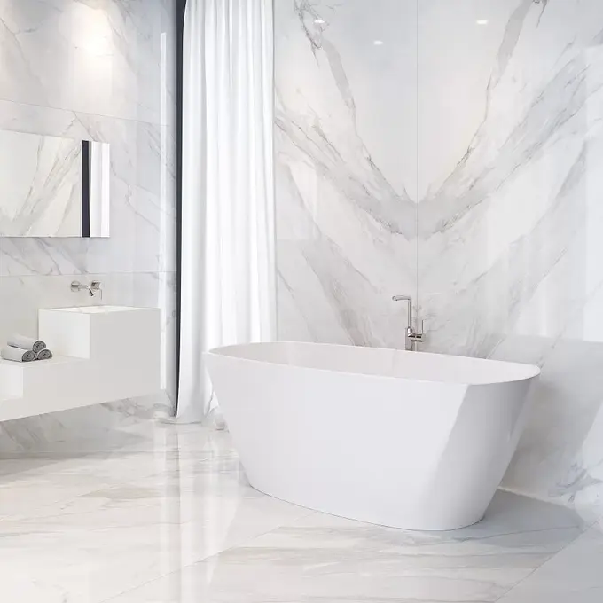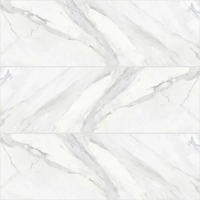 Porcelanato de gran formato que captura la esencia del mármol Calacata, ofreciendo una solución estética y funcional para revestimientos de pisos y muros en proyectos arquitectónicos y de interiorismo.