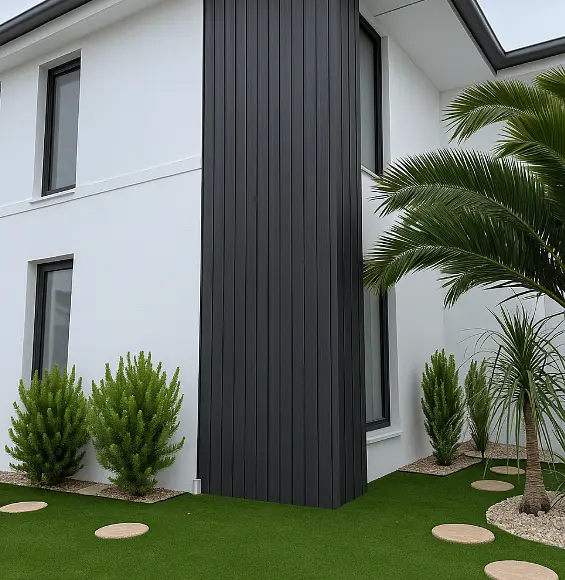 Wall Panel Exterior WPC Co-Extruido con recubrimiento SURLYN™ Revestimiento arquitectónico de alta durabilidad para uso en exteriores, desarrollado con tecnología de co-extrusión con SURLYN™, que asegura máxima resistencia al agua, rayos UV e impactos. Disponible en 3 colores, es la solución perfecta para fachadas, muros, cielos y proyectos tanto residenciales como institucionales. Fabricado con materiales reciclados (WPC), este panel es fácil de instalar, no requiere pintura ni mantención intensiva y ofrece una larga vida útil, combinando diseño, sustentabilidad y alto desempeño en aplicaciones de interior y exterior.