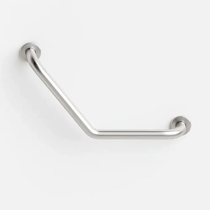 Barra de seguridad angular de 130° ideal para baños adaptados, fabricada en acero inoxidable AISI 304 satinado antideslizante. Con una longitud de 62 cm y diseño ergonómico, esta barra aporta soporte seguro y estética moderna en entornos residenciales y públicos.