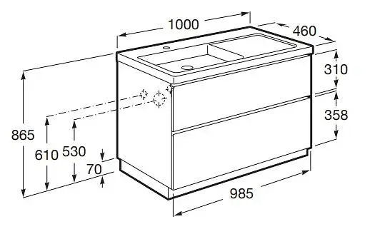 Mueble Base con Lavamanos Sobremueble a la Izquierda / Dos Cajones / Sifón Incluido / No Incluye Grifería /Módulo Columna Opcional / Patas Opcionales / Imágenes Referenciales / Varios Colores y Medidas Disponibles