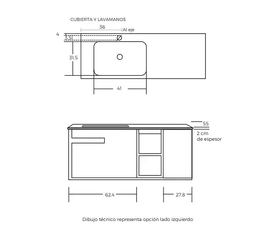 Diseño versátil: Cuenta con una configuración adaptable, ofreciendo opciones para instalación con lavamanos a la izquierda o a la derecha, según las necesidades específicas de su espacio.