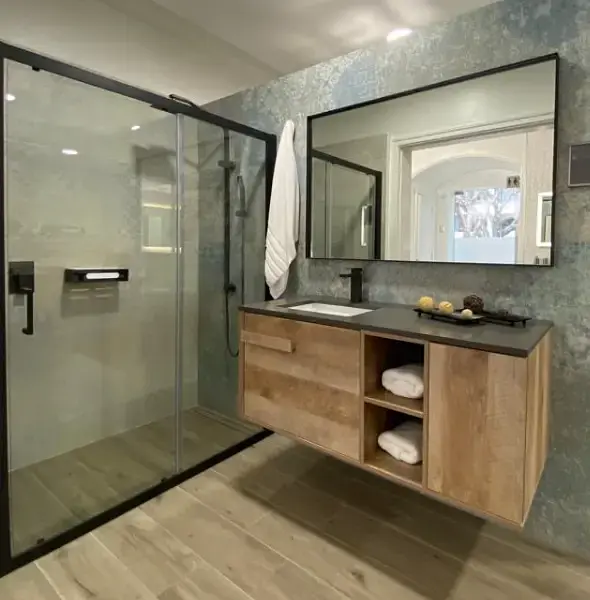 Cubierta de cuarzo gris: Incluye una cubierta de cuarzo gris de 2 cm de espesor con un lavamanos integrado bajo cubierta y sistema de rebalse, facilitando la limpieza y aportando una estética uniforme y elegante.