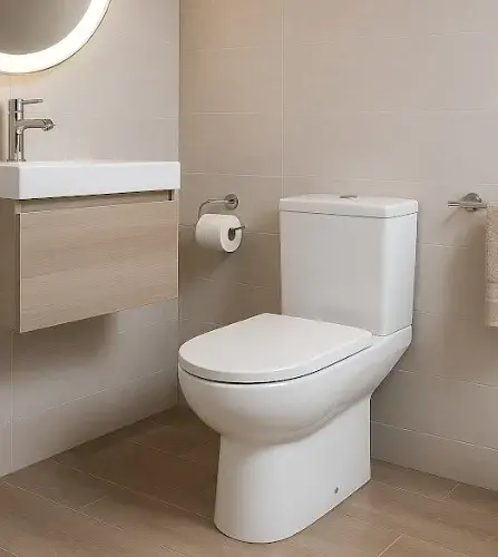 Accesorios incluidos: El paquete incluye asiento y tapa de WC de urea, mecanismo de descarga con doble botón, fijaciones al piso, manguito correspondiente según la descarga seleccionada, flexible de polímero de 1/2" y llave angular de 1/2", proporcionando todo lo necesario para una instalación completa y eficiente.