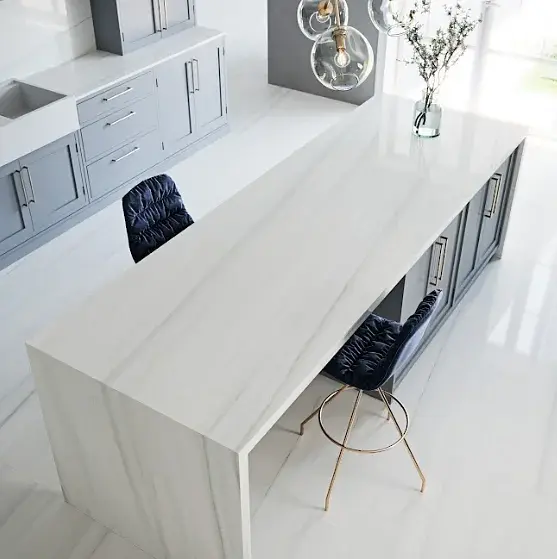 Cubierta de porcelanato de gran formato que combina la elegancia del mármol con las ventajas técnicas del porcelanato, ideal para diversas aplicaciones en interiores.