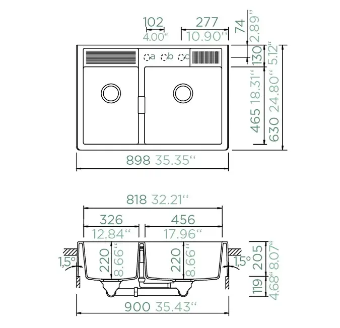 Incluye 3 pre-perforaciones para instalación de griferías y/o accesorios por sobre el lavaplatos. Incluye broca diamantada para las perforaciones.