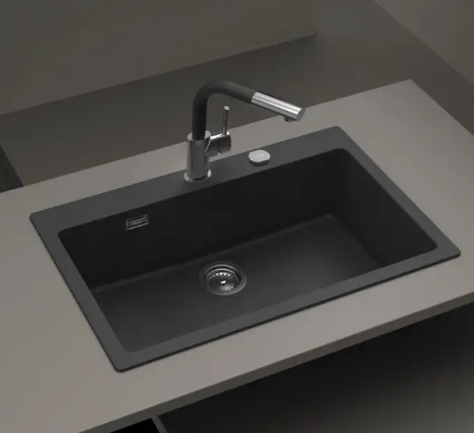 Composición de 80% de cuarzo, 20% resina acrílica entregando una superficie de alta resistencia a impactos, repelente a la suciedad, a prueba de calor y pro higiénico (superficie antibacterial)