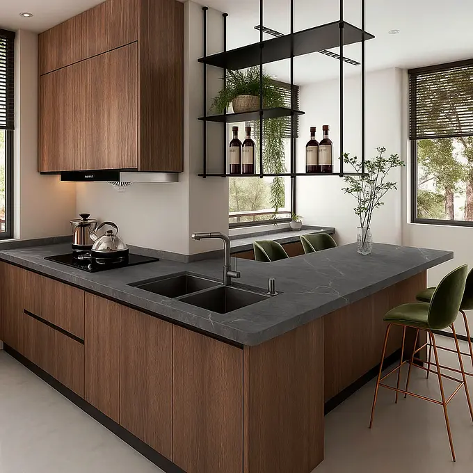 Cubierta de porcelanato de alta tecnología, diseñada para ofrecer un rendimiento superior y una estética sofisticada en espacios de cocina y otras áreas interiores.