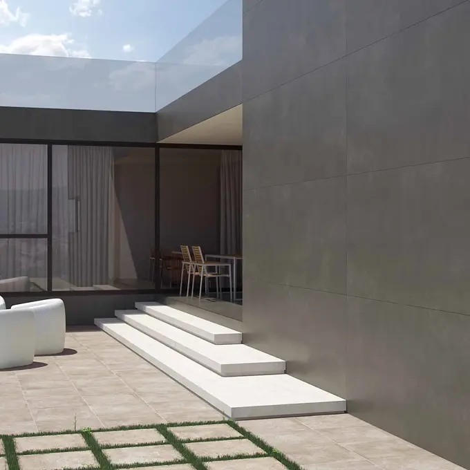 Porcelanato de gran formato que ofrece una estética industrial y contemporánea, ideal para revestir muros en proyectos arquitectónicos y de interiorismo.